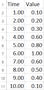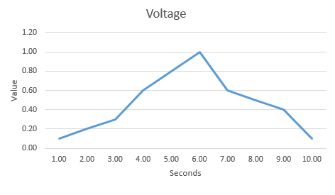 In this case we can probably safely assume that at 8.5 seconds the value was roughly .45 volts. Note the lack of dots at the data points. Even though this is discreet data, it is designed to represent something continuous.
