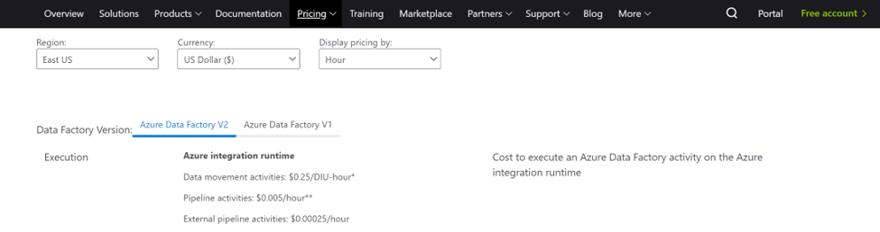 The ADF team created a metric that simplifies pricing calculations called Data Integration Unit (DUI). Execution costs are calculated based on the number of DUIs consumed by the pipeline(s) at runtime. Azure-SSIS runtime uses different pricing but also ties to complexity/unit-of-time concepts.